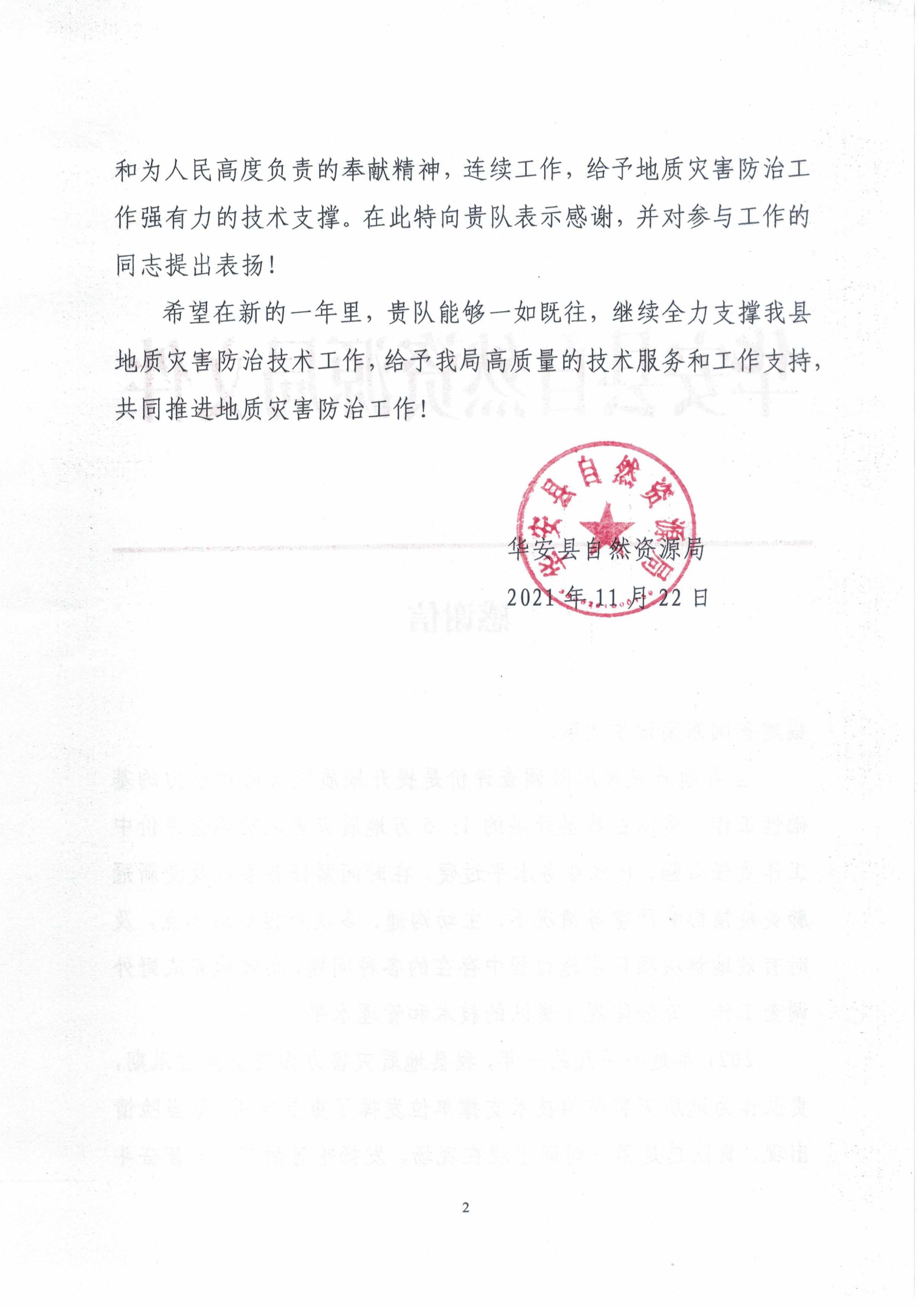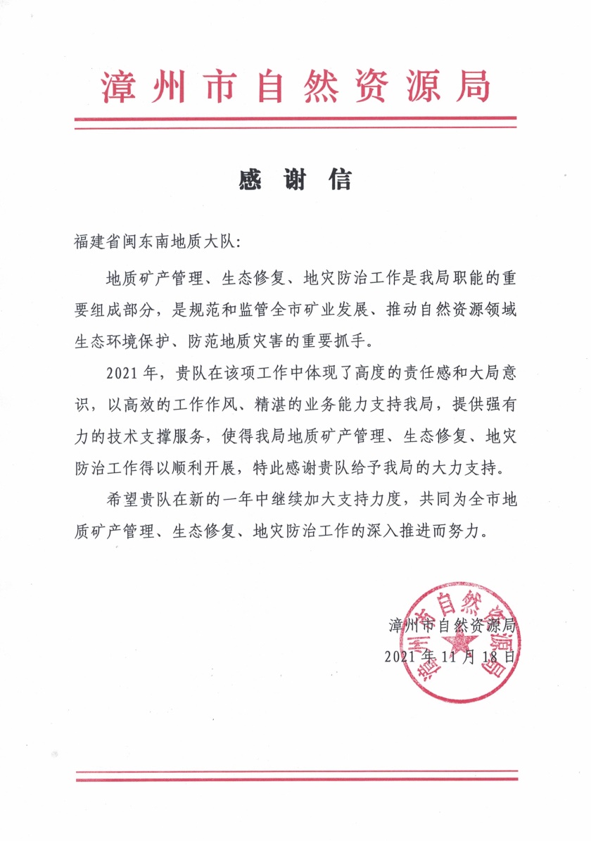 漳州市自然资源局感谢该队在2021年体现了高度的责任感和大局意识,以高效的工作作风、精湛的业务能力,在地质矿产管理、生态修复、地灾防治工作等方面提供强有力的技术支撑服务,感谢其给予的大力支持。