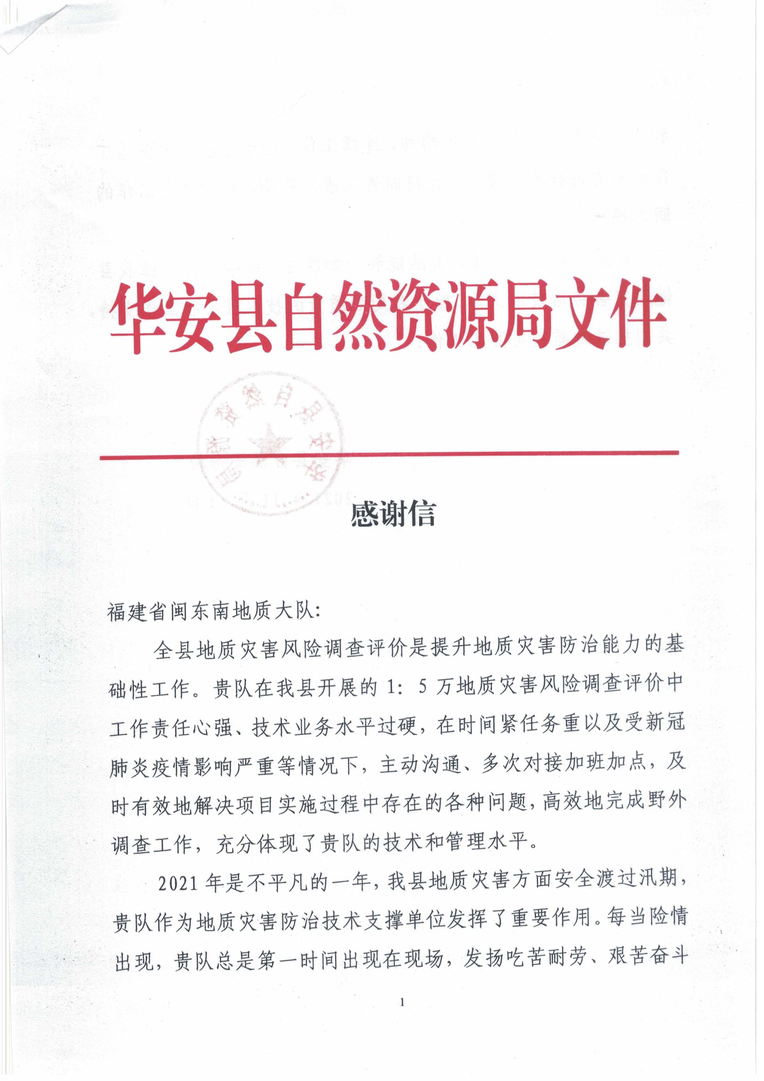 华安县自然资源局在感谢信中称,该队在华安开展的1:5万地质灾害风险调查评价中工作责任心强、技术业务水平过硬,主动沟通、多次对接加班加点,及时有效地解决项目实施过程中存在的各种问题,高效地完成野外调查工作,充分体现了技术和管理水平。同时,感谢该队在地质灾害防治技术方面发扬吃苦耐劳、艰苦奋斗和为人民高度负责的奉献精神,表扬参与工作的相关同志。