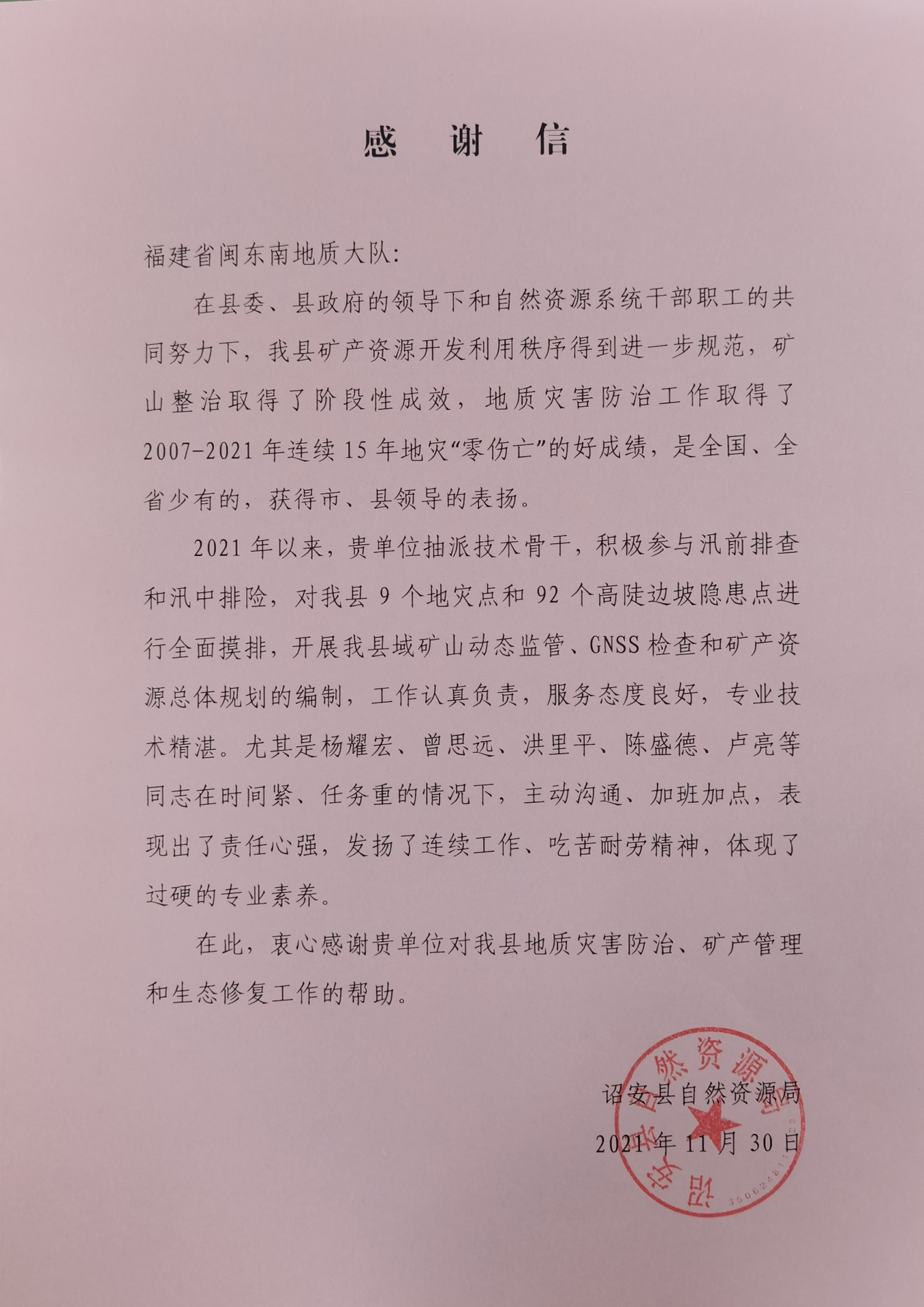 诏安县自然资源局在信中说到,2021年以来,该队抽派技术骨干,积极参与诏安县汛前排查和汛中排险,对诏安县9个地灾点和92个高陡边坡隐患点进行全面摸排,开展矿山动态监管、GNSS检查和矿产资源总体规划等工作。尤其是杨耀宏、曾思远、洪里平、陈盛德、卢亮等同志在时间紧、任务重的情况下,主动沟通、加班加点,表现出了责任心强,发扬了连续工作、吃苦耐劳精神,体现了过硬的专业素养。