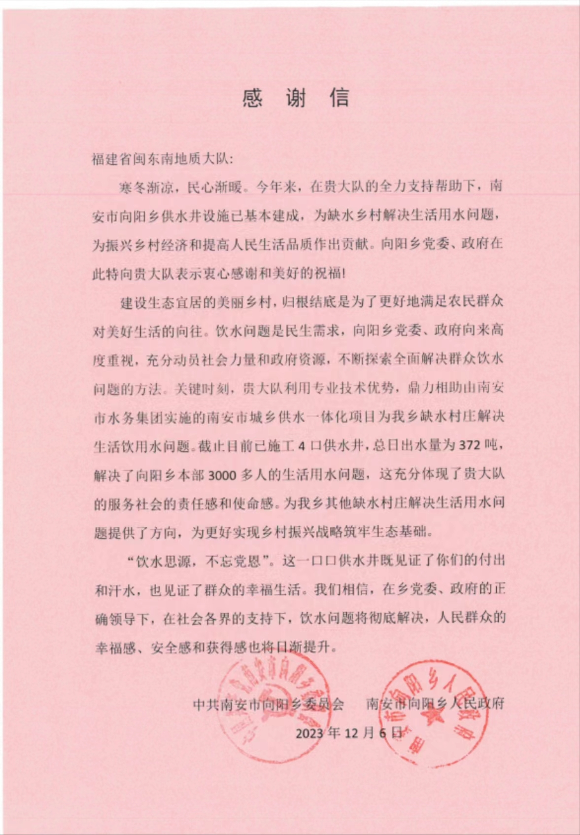 “饮水思源,不忘党恩”。近日,福建省闽东南地质大队收到来自中共南安市向阳乡委员会、南安市向阳乡人民政府的感谢信。