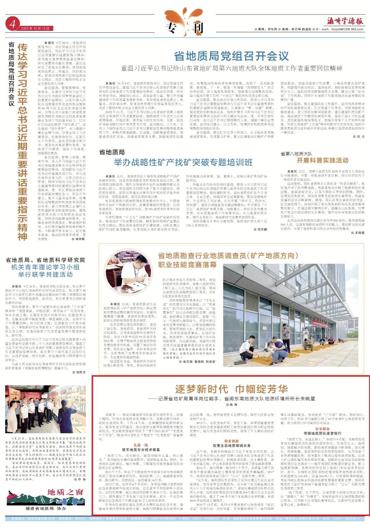 10月15日出版的《海峡资源报》报道我队地质环境所所长,高级工程师朱晓星工作14年来,在保障国家能源资源安全、服务生态文明建设、防治地质灾害等领域的先进事迹。